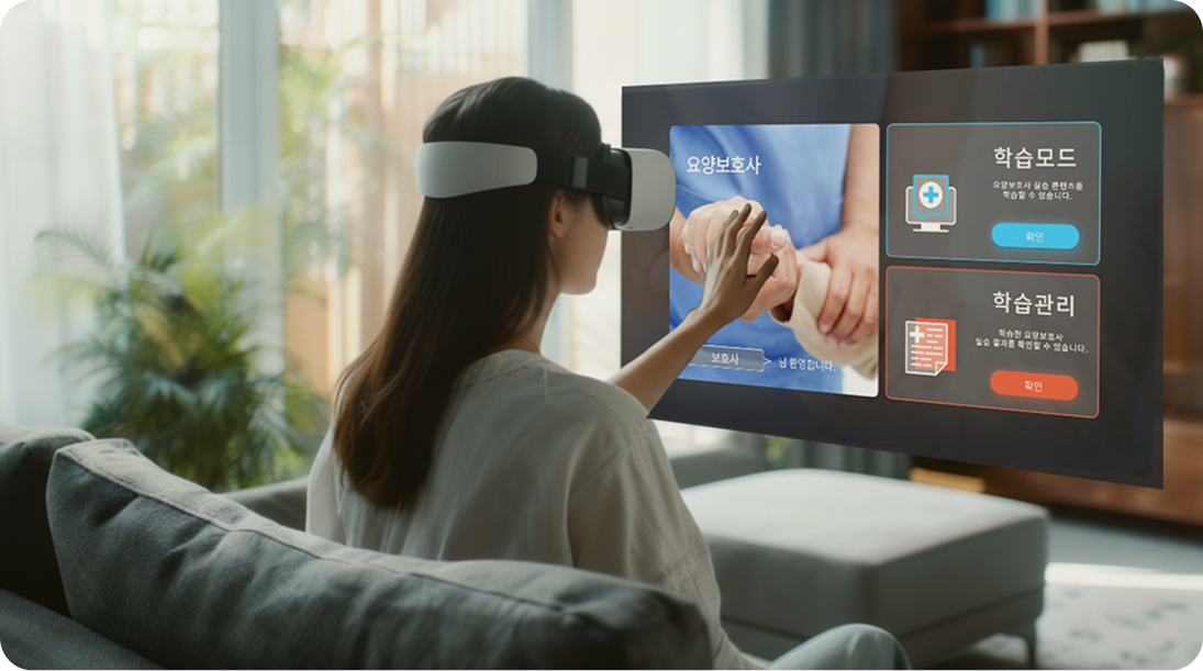 상황 기반 시뮬레이션으로 어르신의 일상 돌봄과 안전, 의사소통 절차를 익히고, 리포트로 학습 결과를 관리